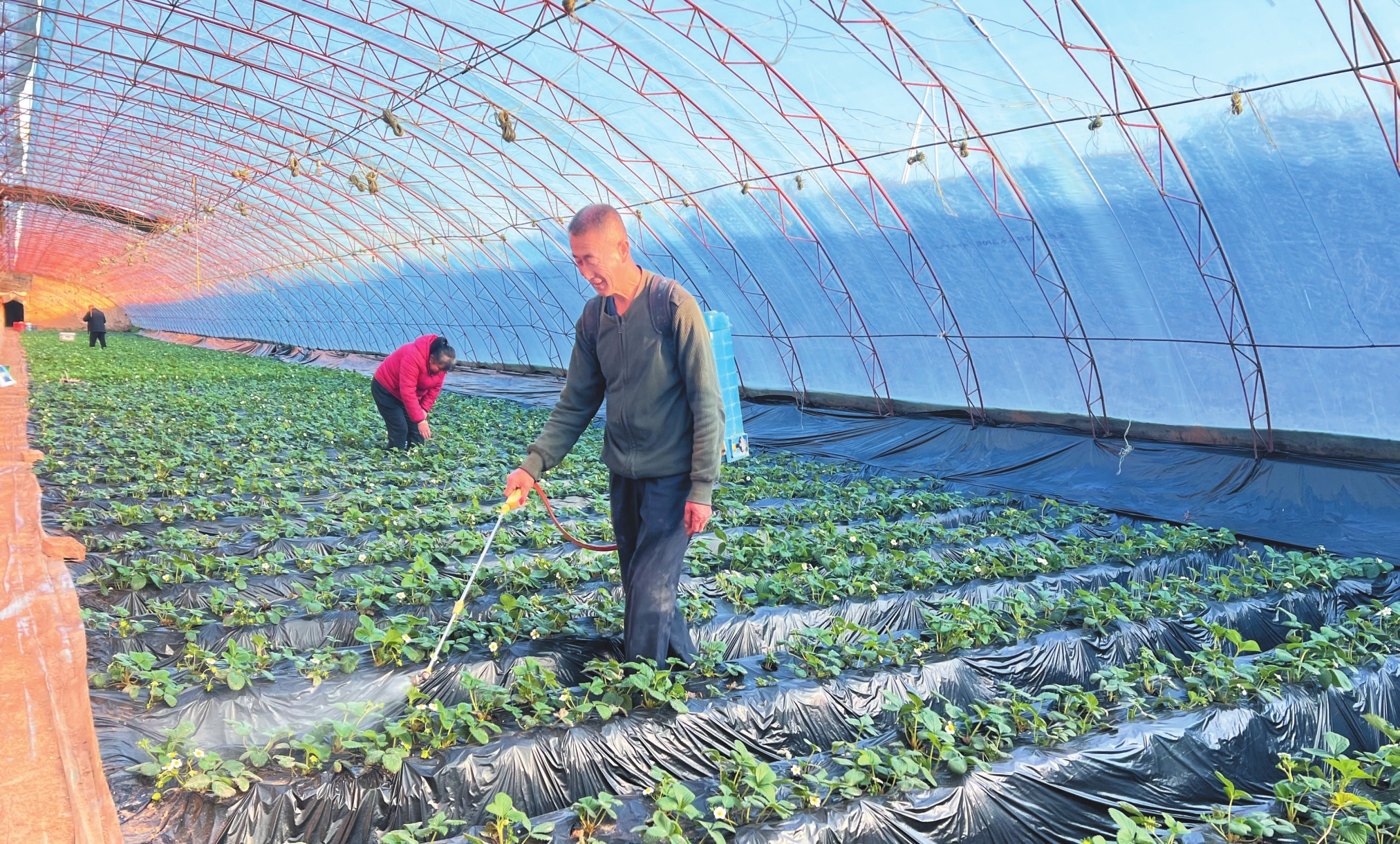 初冬寒意漸濃,河曲縣唐家會(huì)村的溫室大棚里卻充滿生機(jī),張俊田夫婦正細(xì)致地給草莓做噴灑養(yǎng)護(hù)。(