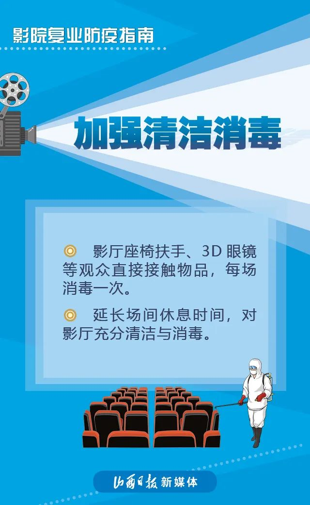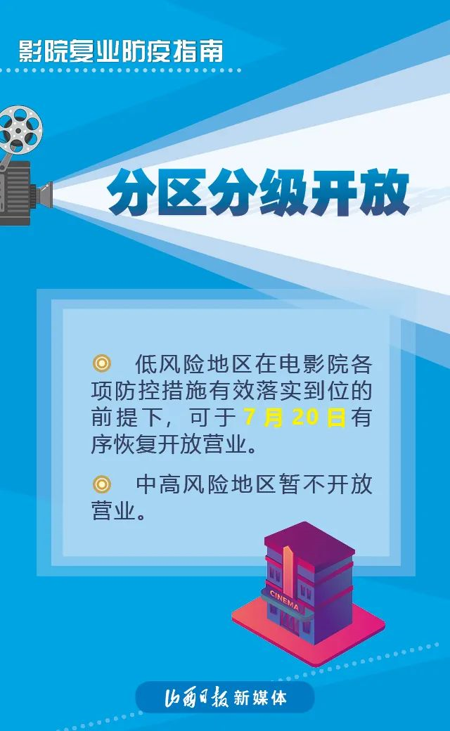近日,國家電影局發(fā)布《關(guān)于在疫情防控常態(tài)化條件下有序推進電影院恢復(fù)開放的通知》稱,低風(fēng)險地區(qū)在電影院各項防控措施有效落實到位的前提下,可于7月20日有序恢復(fù)開放營業(yè)。具體要求如下↓↓↓