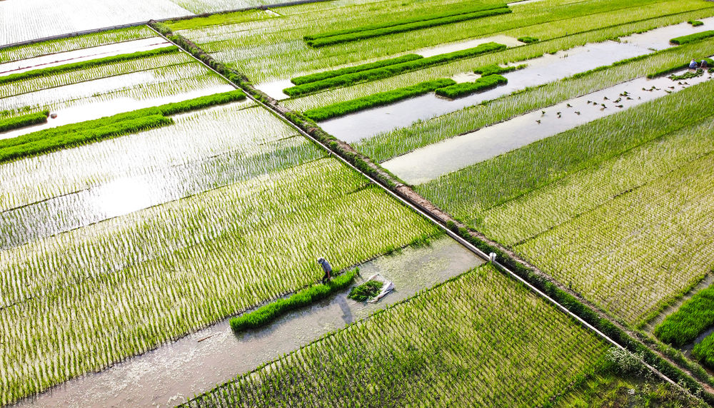 2020年6月14日,農(nóng)民在洛陽市孟津縣會(huì)盟鎮(zhèn)黃河岸邊的萬畝優(yōu)質(zhì)水稻種植示范基地內(nèi)移栽水稻秧苗(無人機(jī)照片)。新華社發(fā)(黃政偉 攝)