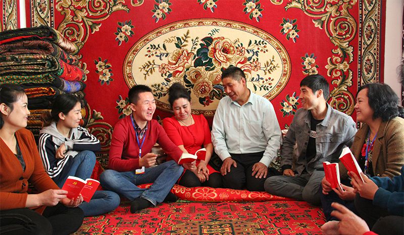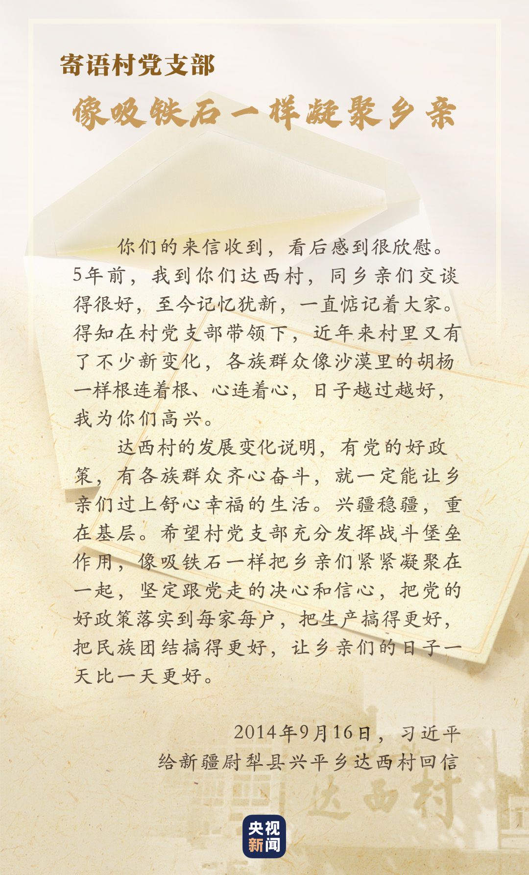 打贏脫貧攻堅(jiān)戰(zhàn),特別要建強(qiáng)基層黨支部。 習(xí)近平多次對村第一書記和駐村工作隊(duì)提出要求,“要真抓實(shí)干、堅(jiān)持不懈,真正把讓人民群眾過上好日子作為自己的奮斗目標(biāo)”。 達(dá)西村地處塔克拉瑪干沙漠東北邊緣,新疆維吾爾自治區(qū)巴音郭楞蒙古自治州尉犁縣城邊上。過去,這里“一年四季白茫茫,只見播種不見糧”。沙吾爾·芒力克1980年擔(dān)任村黨支部書記后,帶領(lǐng)各族群眾開挖排堿渠,種植防風(fēng)林,發(fā)展集體經(jīng)濟(jì),共同走上致富路。 △達(dá)西村村民在聆聽駐村工作隊(duì)隊(duì)員宣講黨的好政策。 “口袋里要鼓囊囊,精神上要亮堂堂”。2014年4月,習(xí)近平在新疆考察時(shí)講到了達(dá)西村的村訓(xùn)。村民們懷著激動(dòng)的心情給總書記寫信,匯報(bào)這些年村里的積極變化。當(dāng)年9月,習(xí)近平總書記給沙吾爾·芒力克和全體村民回信,強(qiáng)調(diào)興疆穩(wěn)疆,重在基層。 如今,達(dá)西村是3A級景區(qū)。以達(dá)西展覽館為龍頭,風(fēng)情街、馕產(chǎn)業(yè)街、夜市、風(fēng)情園、香梨園……串聯(lián)起達(dá)西村鄉(xiāng)村旅游格局。