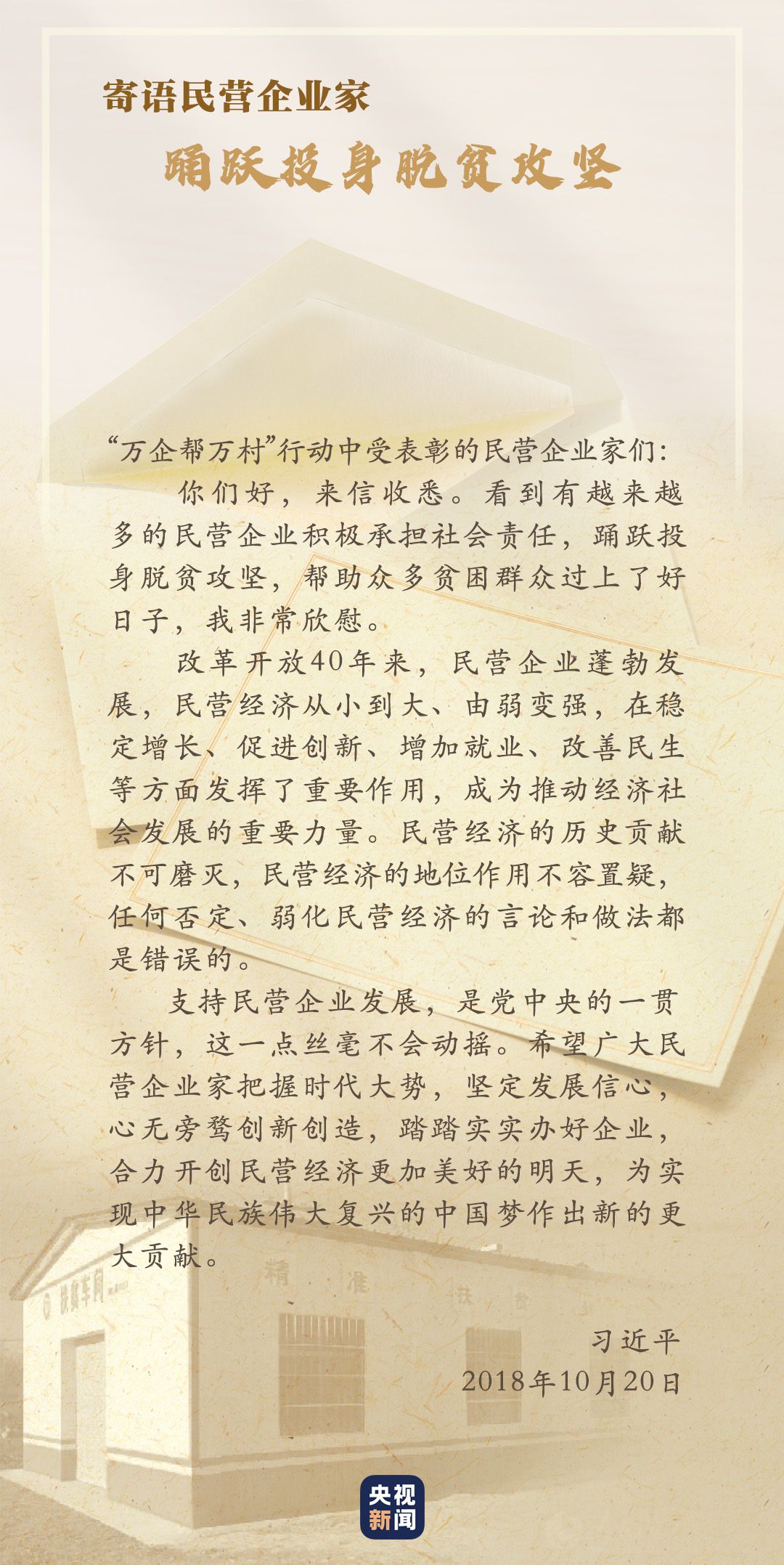 習(xí)近平對民營企業(yè)高度重視,給“萬企幫萬村”行動(dòng)中受表彰的民營企業(yè)家回信,對他們踴躍投身脫貧攻堅(jiān)予以肯定,勉勵(lì)廣大民營企業(yè)家堅(jiān)定發(fā)展信心,踏踏實(shí)實(shí)辦好企業(yè)。 在寧夏永寧縣閩寧鎮(zhèn),一批批福建民營企業(yè)家投身脫貧幫扶工作,在寧夏積極建廠,支持當(dāng)?shù)亟?jīng)濟(jì)發(fā)展,解決當(dāng)?shù)匕傩站蜆I(yè)。截至2019年底,已有5700家福建籍企業(yè)、商戶入駐寧夏。