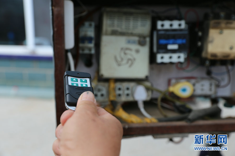 大棚里的噴灌設(shè)施可以通過(guò)遙控器控制,這是劉振義自己設(shè)計(jì)制作的“神器”。每天夜里,木耳大棚要澆兩次水,有了這個(gè)遙控器就不用再出門開(kāi)關(guān)噴灌器了。新華網(wǎng)曹楨攝