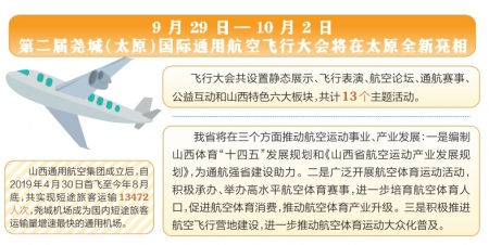 為加大我省通航產業(yè)招商引資力度,促進山西通航短途運輸、低空旅游、應急救援、飛行培訓等業(yè)務飛速發(fā)展,加快航空科技、航空制造、高新技術研發(fā)等創(chuàng)新企業(yè)落地山西,推動全產業(yè)鏈通用航空業(yè)加快發(fā)展,在成功舉辦第一屆的基礎上,9月29日—10月2日,第二屆堯城(太原)國際通用航空飛行大會將在太原全新亮相。