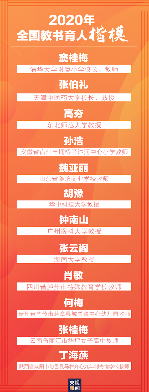 9月4日,2020年全國(guó)教書育人楷模名單發(fā)布,首次由中宣部和教育部聯(lián)合表彰,首次增加2個(gè)優(yōu)秀抗疫教師名額,共計(jì)推出12位“全國(guó)教書育人楷?!?。