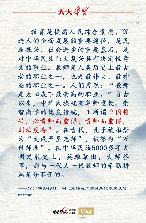 黨的十八大以來,以習(xí)近平同志為核心的黨中央高度重視教育工作,堅(jiān)持把優(yōu)先發(fā)展教育事業(yè)作為推動黨和國家各項(xiàng)事業(yè)發(fā)展的重要先手棋。2014年9月9日,習(xí)近平總書記在同北京師范大學(xué)師生代表座談講話中,引用荀子的“國將興,必貴師而重傅;貴師而重傅,則法度存”,強(qiáng)調(diào)教育對國家繁榮、民族振興的重要意義。