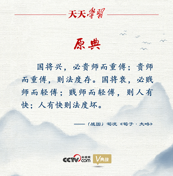 《荀子·大略》更是把教師地位提高到攸關(guān)國家興亡的高度:“國將興,必貴師而重傅;貴師而重傅,則法度存。”意思是,國家將要興盛,一定尊敬老師并看重有技能的人;如此,規(guī)矩和制度就能保持并得以推行。反之,國家將要衰微,一定鄙視老師并看輕有技能的人,如此人們就產(chǎn)生放肆之心;人有了放肆之心,規(guī)矩和制度就會被破壞。這一觀點(diǎn)在中國思想史上產(chǎn)生了十分深遠(yuǎn)的影響。