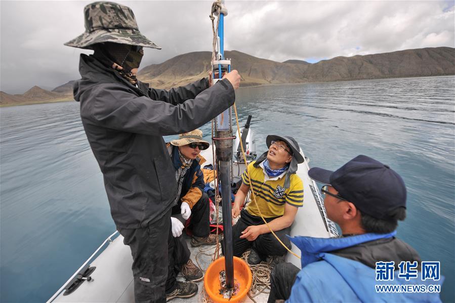 第二次青藏高原綜合科考的科考隊員在對羊卓雍錯進行深度測量,并標記沉積物巖芯(2019年7月22日攝)。新華社記者 晉美多吉 攝