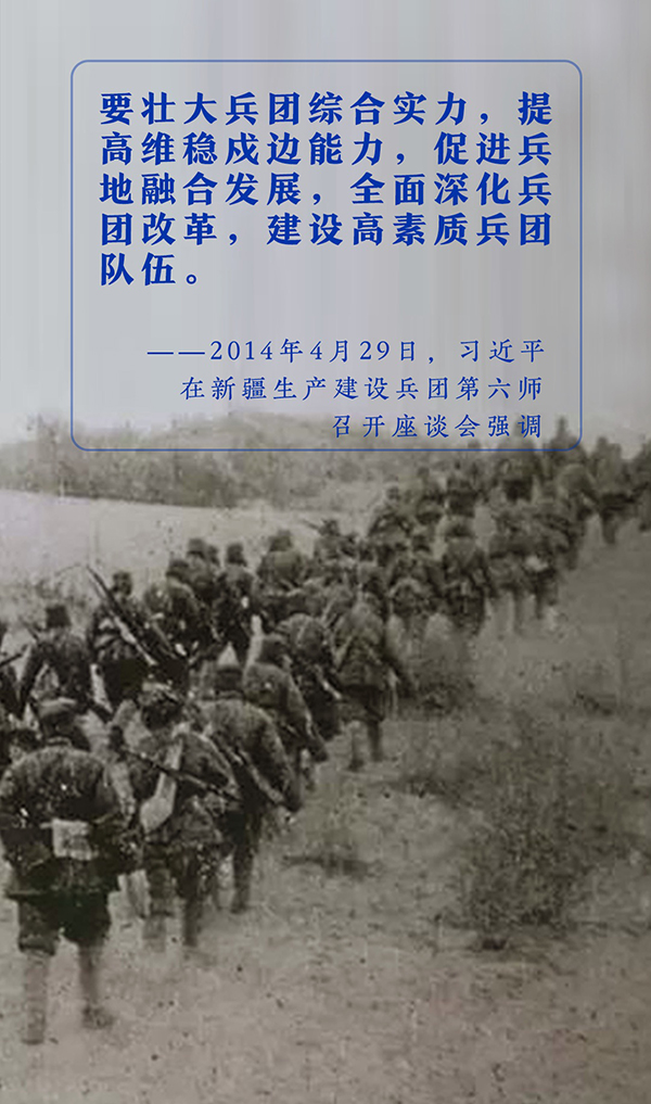 一代代各族兒女發(fā)揚(yáng)胡楊精神、兵團(tuán)精神,無畏艱險(xiǎn)、勇往直前、甘于奉獻(xiàn),奮力為建設(shè)一個(gè)團(tuán)結(jié)和諧、繁榮富裕、文明進(jìn)步、安居樂業(yè)的中國特色社會(huì)主義新疆作出貢獻(xiàn)。