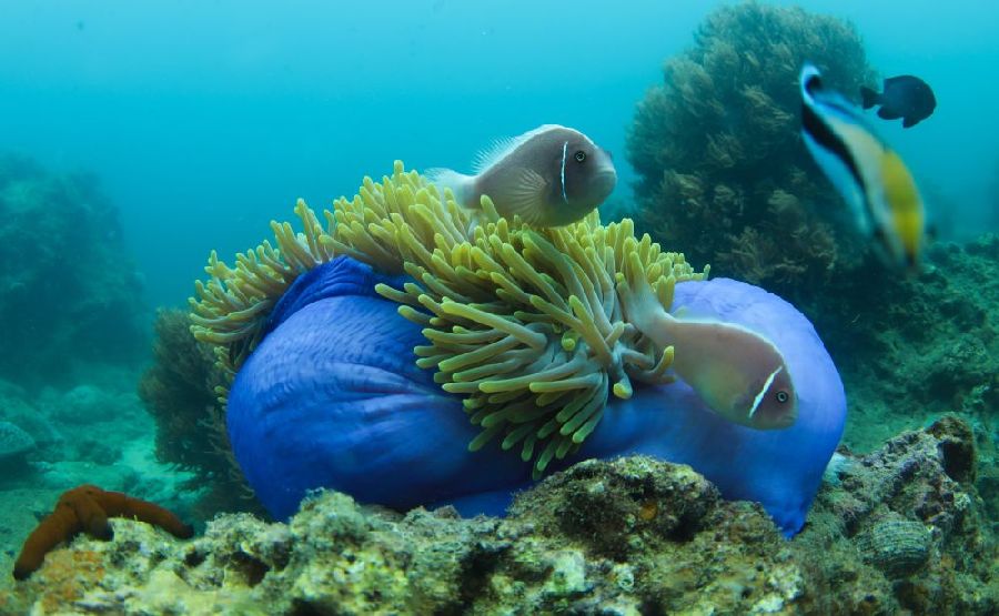 這是2020年5月28日在中國(guó)海南三亞蜈支洲島海域拍攝的與海葵共生的小丑魚(yú)。新華社記者 楊冠宇 攝