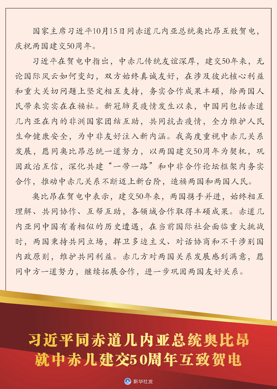 新華社北京10月15日電 國家主席習(xí)近平10月15日同赤道幾內(nèi)亞總統(tǒng)奧比昂互致賀電,慶祝兩國建交50周年。