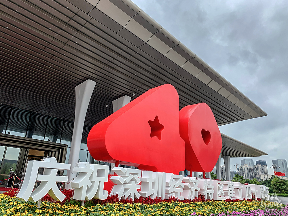 △“40”是慶祝大會當(dāng)天最醒目、設(shè)計最獨特的數(shù)字。4里面是一顆五角星,取自五星紅旗,0里面是一顆愛心,這個標識的名字叫做“星心相映”,寓意著深圳是一顆明日之星,也是一座愛心之城。(總臺央視記者程鋮拍攝)