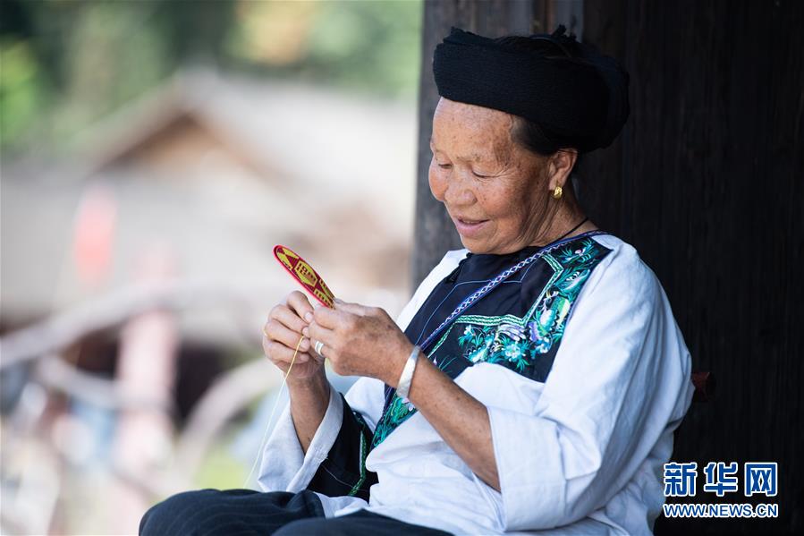 湖南花垣縣十八洞村老人龍德曬正在自家門口為兒女們繡鞋墊(2019年9月30日攝)。新華社記者 陳思汗 攝