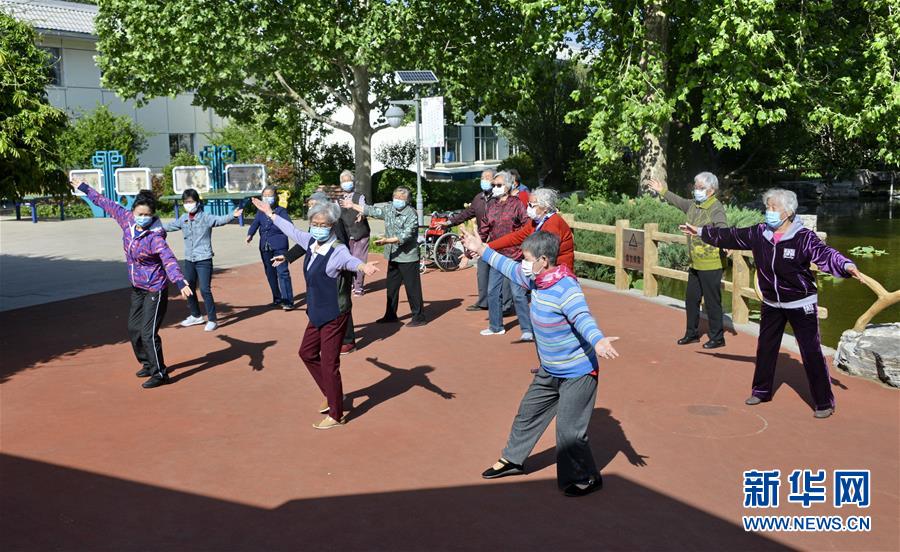 北京海淀區(qū)四季青鎮(zhèn)敬老院的老人們在學(xué)習(xí)跳舞(2020年5月10日攝)。新華社記者 李欣 攝