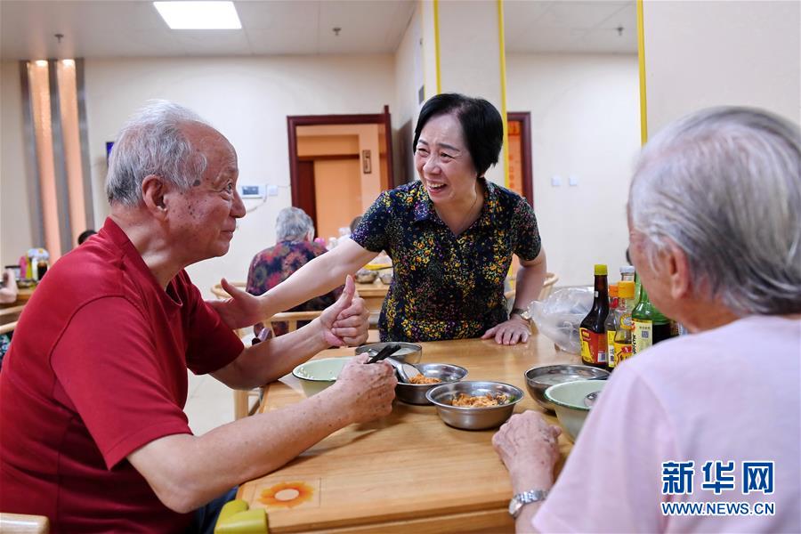 福州市鼓樓區(qū)東街街道軍門社區(qū)老人劉建國(左)在社區(qū)居家養(yǎng)老服務(wù)照料中心就餐(2019年7月30日攝)。新華社記者 林善傳 攝