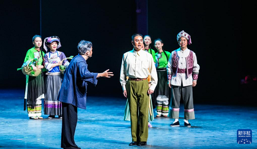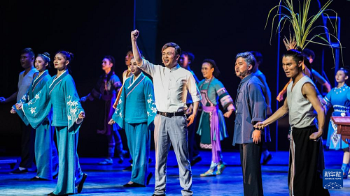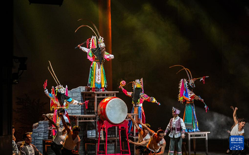 演員在貴州飯店國(guó)際會(huì)議中心表演民族歌舞劇《山河同心》(7月30日攝)。(新華社記者 陶亮 攝)