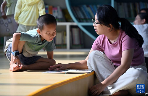8月3日,家長帶著孩子在位于??谑械暮D鲜D書館讀書。(新華社記者 郭程 攝)