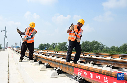 8月6日,中鐵一局施工人員在淮宿蚌城際鐵路鋪軌施工現(xiàn)場作業(yè)。(新華社記者 周牧 攝)