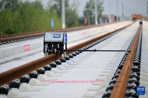 8月6日,智能螺栓機在淮宿蚌城際鐵路鋪軌施工現(xiàn)場自動作業(yè)。(新華社記者 周牧 攝)