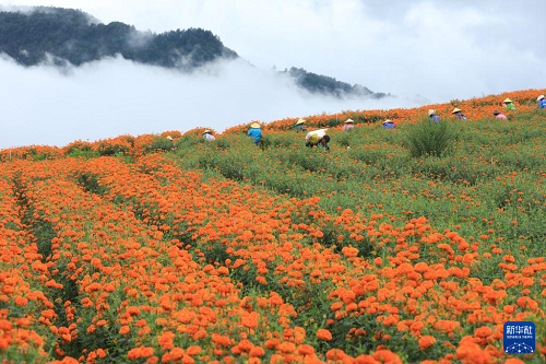 8月7日,在云南騰沖市固?hào)|鎮(zhèn),農(nóng)民采收萬壽菊。(新華社發(fā) 龔祖金 攝)