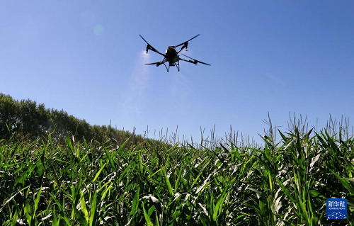 8月7日,在北大荒集團(tuán)黑龍江格球山農(nóng)場(chǎng)有限公司第二管理區(qū),一架植保無人機(jī)為玉米噴施“營(yíng)養(yǎng)液”。(新華社發(fā) 陸文祥 攝)