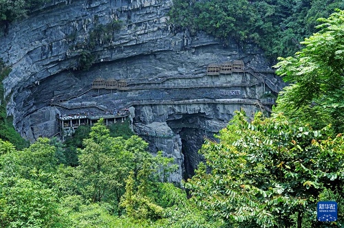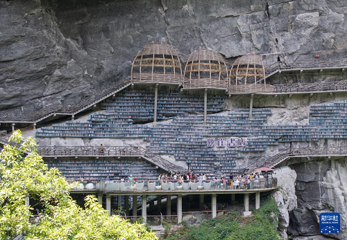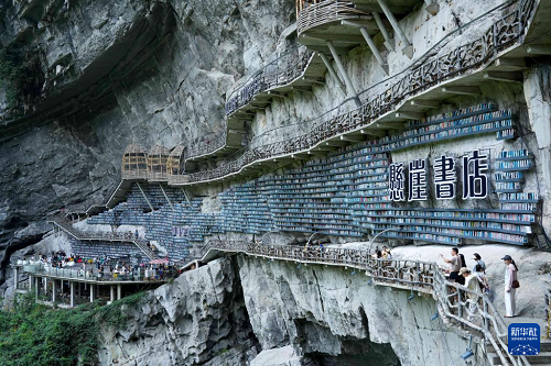 這是8月9日拍攝的廣西河池市羅城仫佬族自治縣棉花天坑景區(qū)內(nèi)的懸崖書(shū)店。(新華社發(fā) 龍濤 攝)