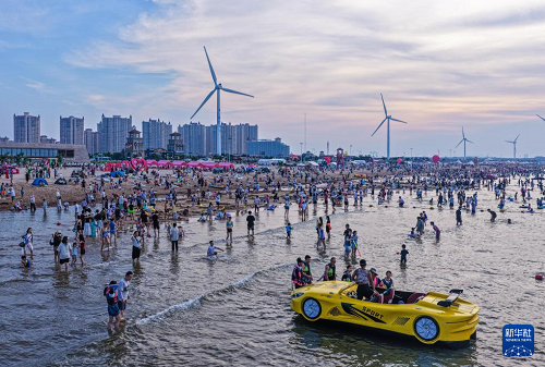 8月23日,游客在位于山東省榮成市的那香海海水浴場(chǎng)體驗(yàn)水上項(xiàng)目(無人機(jī)照片)。(新華社發(fā) 李信君 攝)