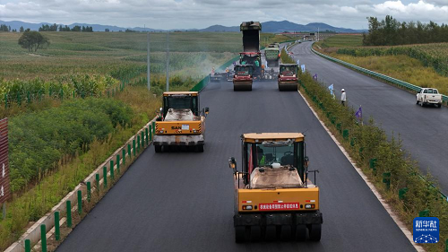8月28日,在鐵科高速公路延壽縣至尚志界段主線,工作人員操作機械設(shè)備進行瀝青攤鋪收尾作業(yè)。(新華社記者 王松 攝)