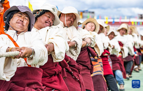 9月6日,在那曲市恰青賽馬節(jié)現(xiàn)場,選手們參加拔河比賽。(新華社記者 丁增尼達(dá) 攝)