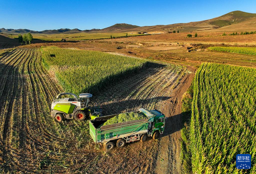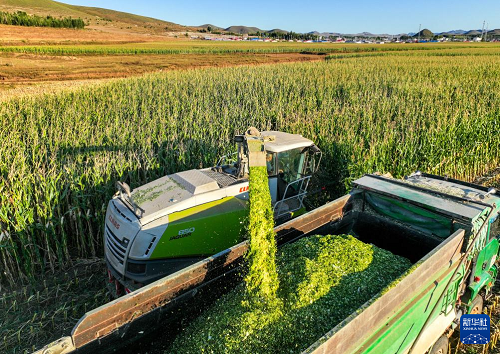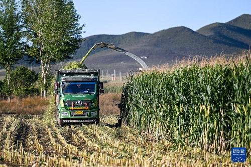 9月18日,在通遼市扎魯特旗巨日合鎮(zhèn),農(nóng)機(jī)在田間收割青貯玉米。(新華社記者 連振 攝)