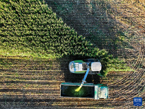 9月18日,在通遼市扎魯特旗巨日合鎮(zhèn),農(nóng)機(jī)在田間收割青貯玉米(無(wú)人機(jī)照片)。(新華社記者 連振 攝)