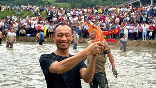 9月22日,在廣西南丹縣芒場鎮(zhèn)巴平村舉行的慶祝豐收節(jié)活動(dòng)上,村民展示抓到的錦鯉。(新華社發(fā) 高東風(fēng) 攝)