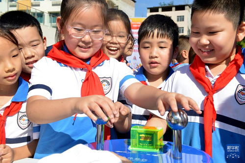 9月25日,四川省南充市南部縣紅巖子小學學生在體驗趣味科普裝置。(新華社發(fā) 張櫪 攝)