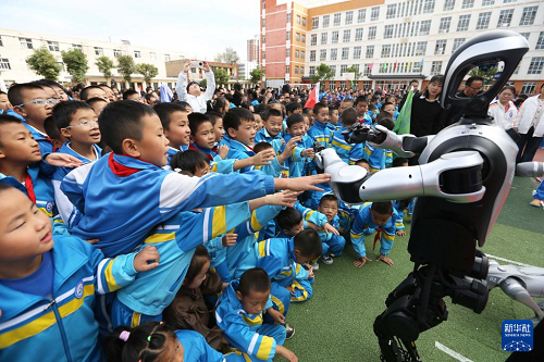 9月25日,在甘肅省定西市安定區(qū)西關小學,學生和人形機器人互動。(新華社發(fā) 王克賢 攝)