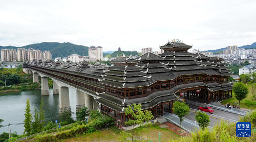 這是9月25日拍攝的三江侗族自治縣的宜陽(yáng)風(fēng)雨橋。該橋橫跨潯江之上,全長(zhǎng)399.6米,寬28米。橋面設(shè)雙向四車(chē)道,橋上共兩層,二層建有跨橋人行通道。(新華社記者 張楓 攝)