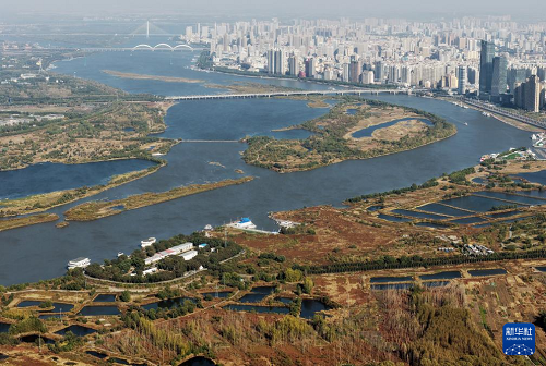 這是10月7日拍攝的哈爾濱群力外灘濕地公園景色(無人機照片)。(新華社記者 王松 攝)