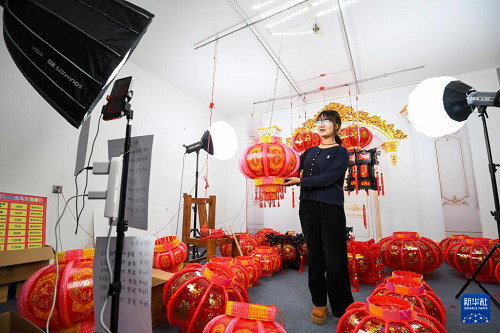 12月10日,在河北省石家莊市藁城區(qū)屯頭村一家宮燈銷售處,直播人員進(jìn)行線上銷售。(新華社發(fā) 張曉峰 攝)