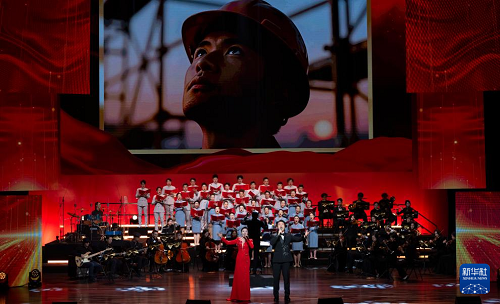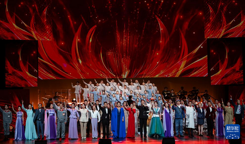 12月16日,在北京二七劇場舉辦的“中國夢·勞動美”2026新年音樂會上,演員在大合唱《億萬職工心向黨》中歌唱。(新華社記者 才揚 攝)