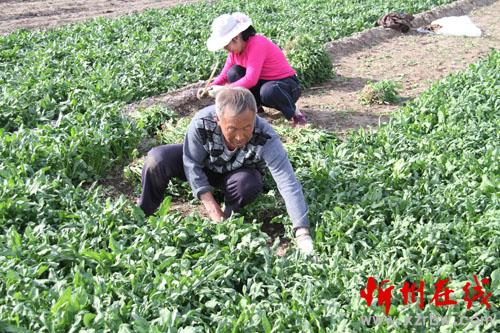 4月7日,原平市南灘村綠油油的菜地里,一對夫妻正在揮鐮收菠菜,準(zhǔn)備銷往市場。該市在落實各項惠農(nóng)政策的同時,積極推進(jìn)農(nóng)業(yè)結(jié)構(gòu)調(diào)整,將簡單粗放型農(nóng)業(yè)向精細(xì)高效型農(nóng)業(yè)提升,使農(nóng)民收入成倍翻番,真正讓農(nóng)民嘗到了甜口。(褚震 攝)