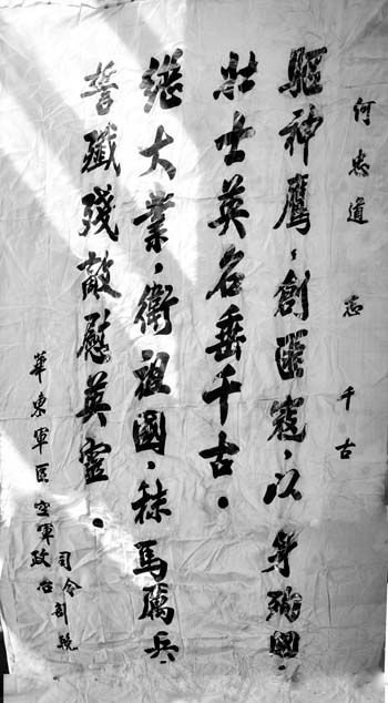 何忠道的犧牲,引起了整個空軍系統(tǒng)的震憾,人民空軍舉行了隆重的追悼大會??哲姍C關(guān)、華東軍區(qū)、生前所在部隊機關(guān)、戰(zhàn)友送了幾十幀挽幛??哲娝玖顔T劉亞樓、副司令員常乾坤、副政委吳法憲、參謀長王秉璋聯(lián)名敬獻的挽幛上書:“殲滅美國侵略者,堅決保衛(wèi)祖國領(lǐng)空,為何忠道同志復(fù)仇!”華東軍區(qū)司令部、政治部敬獻的挽幛上書:“驅(qū)神鷹,創(chuàng)飛寇,以身殉國,壯士英名垂千古。創(chuàng)大業(yè),衛(wèi)祖國,秣馬厲兵,誓殲殘敵慰英靈。”