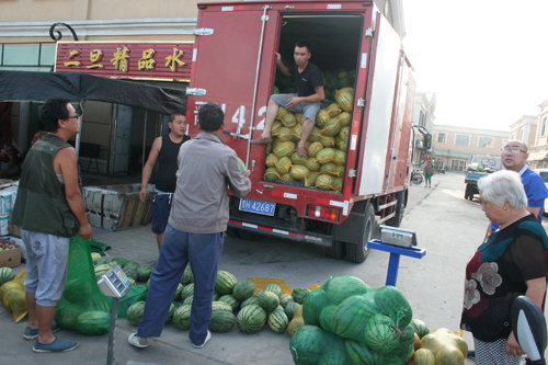 暑期天氣赤日炎炎,8月7日,原平市德金集貿瓜果蔬菜市場大西瓜貨豐價穩(wěn)購銷兩旺,市民們紛紛購買防暑解熱。(趙春曉 攝)