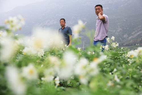 8月13日,原平市紅池村民正在土豆地里查看長勢,兩人看著喜人的土豆開心的笑了。原平市山區(qū)農(nóng)民根據(jù)土地土壤結(jié)構(gòu)松散的特點,以種植土豆為主要農(nóng)作物,不分地塊大小,也不論坡地還是平地,長出的土豆個頭大好吃,既可以當(dāng)主食食用,也可以制作為蔬菜,一食多用,是餐桌上的香餑餑,銷售價格節(jié)節(jié)攀升,是山區(qū)百姓脫貧致富的金圪蛋。(吉建平 攝)