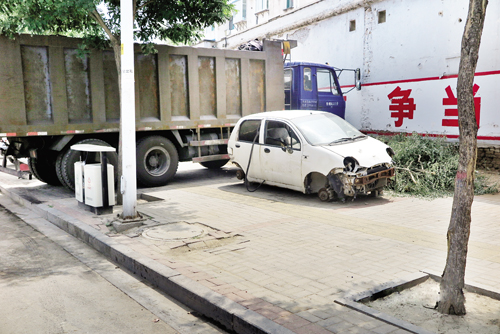 附近的居民們稱,人行道本來(lái)就不寬,這樣的“僵尸車(chē)”長(zhǎng)年累月停放在路邊不僅有礙觀瞻,而且對(duì)市民的出行造成了不小的影響。記者認(rèn)為,這些“僵尸車(chē)”如果廢棄不用的話,就該進(jìn)行報(bào)廢處理,而不是一直停放在路邊。希望車(chē)主能夠盡快現(xiàn)身對(duì)車(chē)輛進(jìn)行處理,同時(shí)也希望交警部門(mén)能夠加大監(jiān)管執(zhí)法力度,讓“僵尸車(chē)”的身影不再出現(xiàn)在街頭巷尾。圖為廢棄的汽車(chē)。(王君 攝)