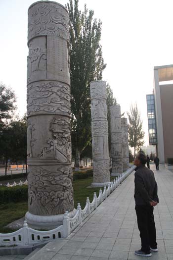 10月9日,原平市民在范亭文體廣場聚落的柱式雕塑前觀看愛國名將續(xù)范亭、東晉名士郝隆等16位名人紀(jì)念雕像。近年來,該市著力打造文化強市,利用柱式雕塑像繪制歷史文化名人、抗日英雄等群體形象,營造濃濃的文化氛圍。(褚震 攝)