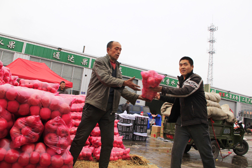 10月23日,原平市果農(nóng)正在德金城農(nóng)產(chǎn)品交易市場卸貨,進行銷售。原平市著力打通農(nóng)產(chǎn)品銷售渠道,通過創(chuàng)建市場、加強管理,將當(dāng)?shù)剞r(nóng)產(chǎn)品規(guī)范到統(tǒng)一銷售場所,抱團銷售農(nóng)產(chǎn)品,不僅方便了消費者,而且便于走出去,打造知名品牌。(吉建平 攝)