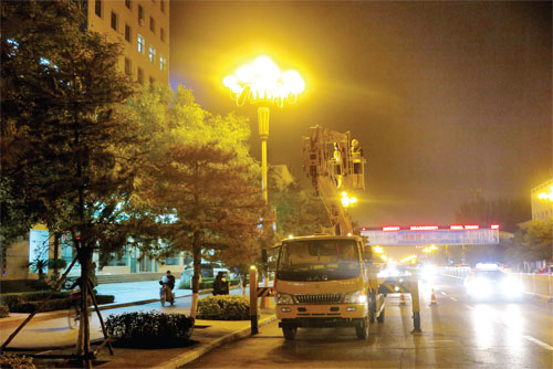 忻州城區(qū)夜幕下的路燈修理工