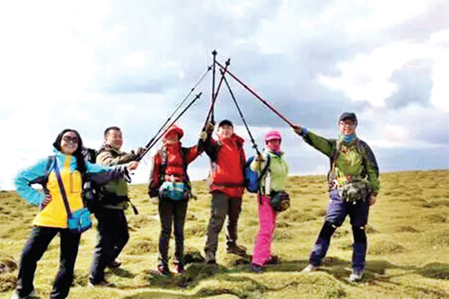 我們不曾相識,一點愛溫暖了人間。從東臺下來,一開始就不見了女兒,還好有閨蜜在身邊談天說地,偶爾“龍哥”擦身而過扔下一句笑話,轉(zhuǎn)眼就不見了蹤影;劉教授常跑國外,腿很長,頭戴禮帽,不用登山杖,腳步輕盈;“大師兄”人見人愛,他的腰間掛一個袋子,是用來裝路上撿到的水瓶、塑料袋、果皮等垃圾的,他身上的雨衣、登山杖好像是給大伙準備的,誰需要就送給誰;郭大律師看見剛從山下上來,上氣不接下氣、氣喘不停的同行人,忙把自己的雨衣翻過來鋪在大石頭上讓人坐?!吧裢取笨偸窃陉犖榈淖詈?,落在后面的人,只要看見“神腿”就信心倍增,和“神腿”合張影,比出個“二”的手勢,仿佛自己也是“神腿”了。吳老師人很好,熱情地幫我拍了一張“打坐”的美照,真可謂不懂攝影的老師不是優(yōu)秀企業(yè)家;見到海濤群主不時從山上往山下跑,照顧落在后面的人;又遇見一位腰間掛垃圾袋的人,他走近一頭正在喂奶的母牛,像老朋友一樣輕輕地撫摸這牛的頭部,聽說他是講國學的馬老師。佛家講的是一種緣分,有緣自然來相會,我和馬老師聊著爬上了一個山頭,心頭一怔,馬老師不就是我們的學問大咖嗎?我們的八月大朝臺隊伍里藏龍臥虎,稍不留神,大咖就會從你身邊溜走。正說著,閨蜜劉老師從我身邊經(jīng)過,腰間掛著一袋子垃圾,直向前面一個易拉罐追去……
