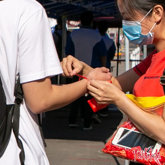 7月7日上午,北京市陳經(jīng)綸中學門口,一位老師為考生戴上代表幸運的紅手鏈。中青報·中青網(wǎng)見習記者 曲俊燕/攝