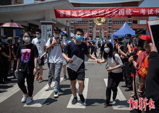 7月7日上午,北京市豐臺區(qū),北京市第十二中學考點,結(jié)束上午的考試后,高考考生們走出考場,一位考生從人群中牽起家人的手。當天是2020年全國統(tǒng)一高考第一天,據(jù)了解,今年北京市高考在7月7日至10日舉行,共49000多名考生,設17個考區(qū),132個考點學校,2867個考場,每考場考生人數(shù)由過去的30人減至20人。中青報·中青網(wǎng)記者 李崢苨/攝