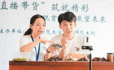 7月24日,在江西省吉安市新干縣潭丘鄉(xiāng)產(chǎn)業(yè)就業(yè)扶貧服務(wù)中心,江西師范大學(xué)暑期社會(huì)實(shí)踐大學(xué)生正在直播推銷(xiāo)當(dāng)?shù)剞r(nóng)家小吃醬餅,助力鄉(xiāng)村振興。李福孫攝(人民視覺(jué))