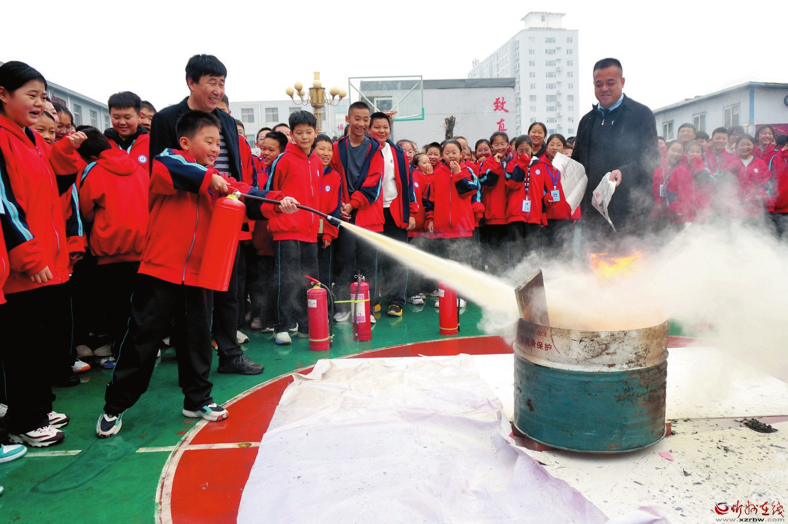為了提升學(xué)?;馂?zāi)疏散組織和管理能力,強化師生安全意識,培養(yǎng)師生的自救能力,10月31日,忻州市第七中學(xué)舉行消防應(yīng)急疏散演練。圖為學(xué)生使用滅火器滅火。(張卯芳 攝)
